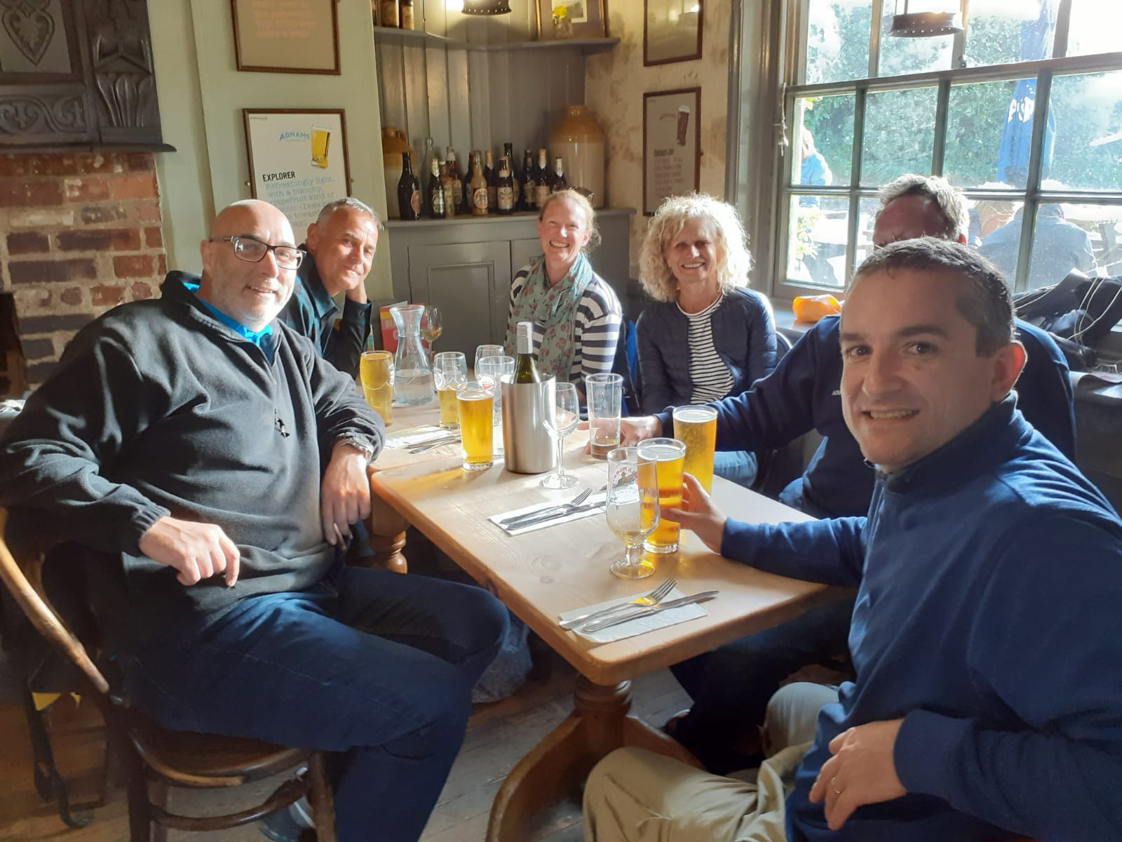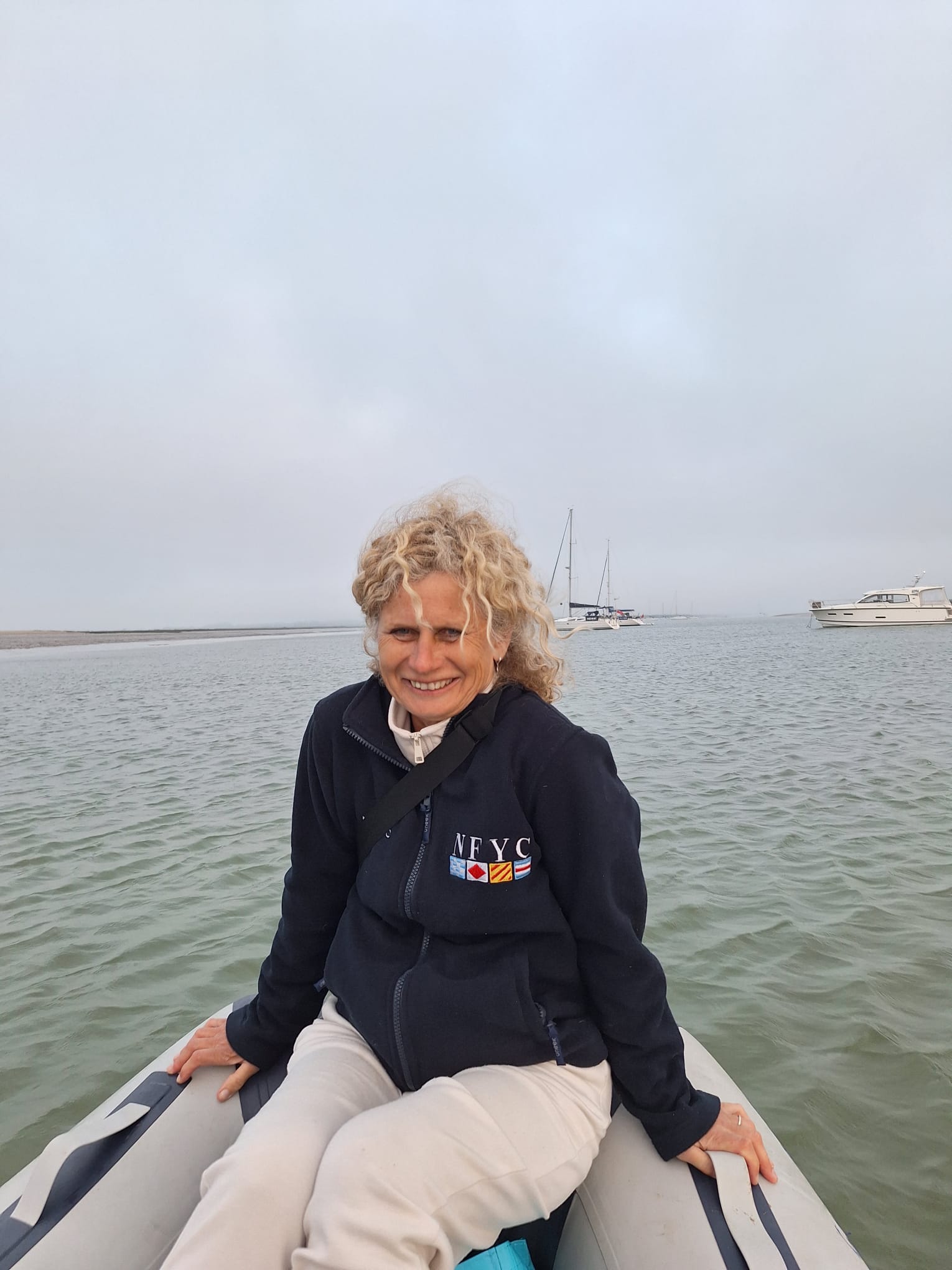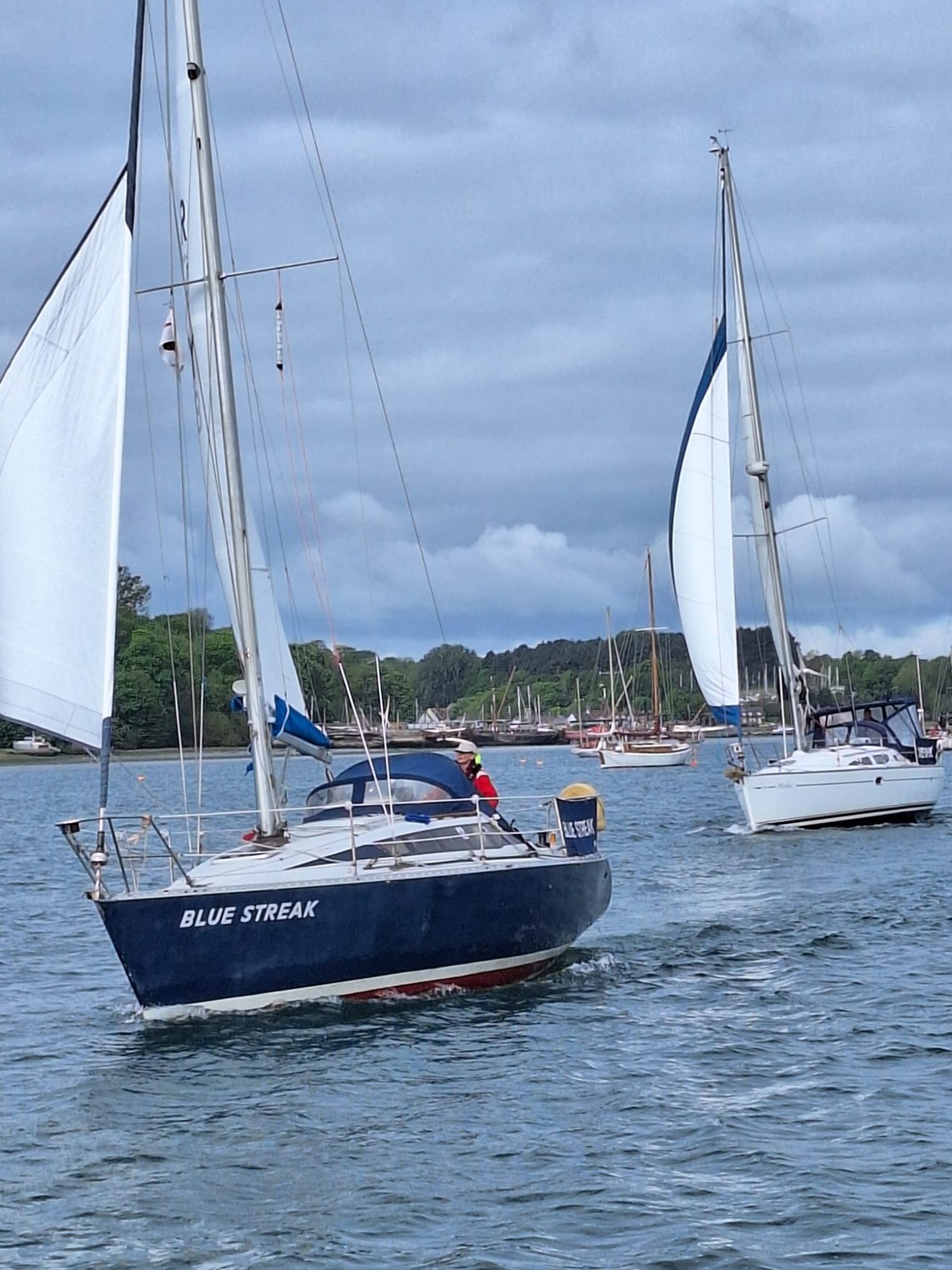 The following morning, after Blue Streak’s engine was repaired, the fleet made its way up the River Orwell to Pin Mill and the well-loved Butt and Oyster pub. Once moored, crews changed into their “go ashore” attire, and a “Menhic Uber taxi” was called to ferry everyone ashore in time for our dinner reservation. The meal was excellent, and spirits were high, especially as it was also the Commodore’s birthday. She extends her thanks to club members for the thoughtful card.